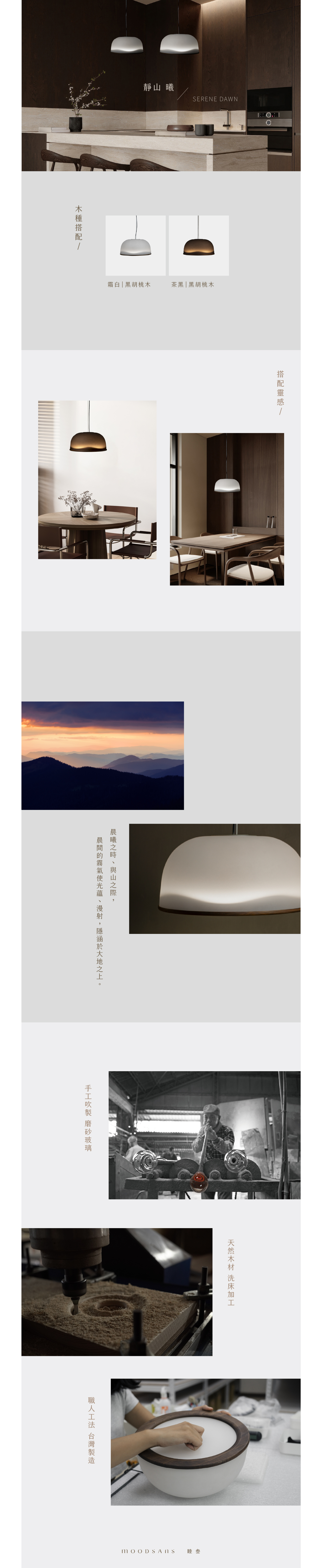 玻璃、木頭的異材質搭配如天與地,將晨間寧靜的山陵線轉譯成為淺淺波浪,透過玻璃隱約透出的柔光,呈現美好光景。